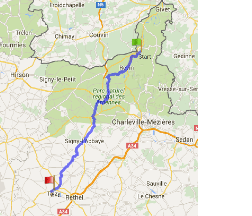 Track 3 start in Frankrijk 08230 Rocroi, Arrondissement de Charleville-Mézières, Champagne-Ardenne naar Chateau Porcien en is 78 km lang. De eerste heuveltjes dienen zich aan.